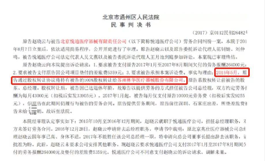 在这份关于北京市通州区人民法院对原告赵晓云与被告悦通医疗的劳务合同纠纷作出一审民事判决(案号:(2017)京0112民初26482号)显示,据赵晓云提供的事实证明,早在2015年5月,赵晓云便通过股权转让协议将其持有的悦通医疗100%股权转让给林华医疗,赵晓云是股权转让前悦通医疗的股东、总经理;在股权转让后,赵晓云因已达退休年龄,故以提供劳务的方式担任悦通医疗总经理。