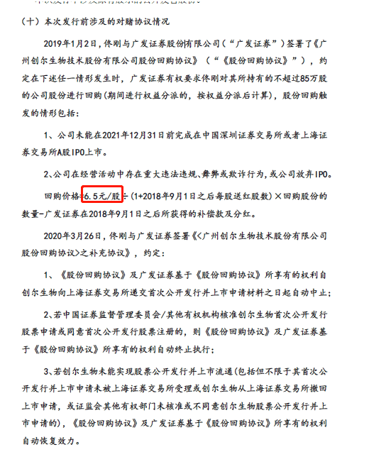 招股说明书显示,2019年1月2日,创尔生物实控人佟刚与广发证券股份有限公司签署了《广州创尔生物技术股份有限公司股份回购协议》,并于2020年3月26日签署了《股份回购协议》之补充协议,就特定情形下回购事宜进行了约定,涉及回购股份数量不超过85万股,回购价格不超过465万元。