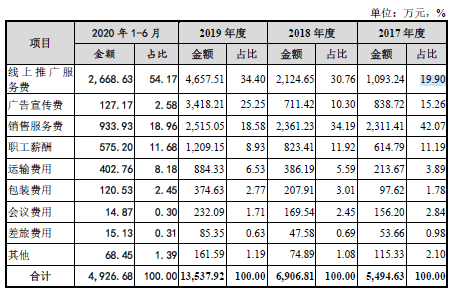 招股说明书显示,报告期内,创尔生物的线上推广服务费分别为1093.24万元、2124.65万元、4657.51万元、2668.63万元;广告宣传费分别为838.72万元、711.42万元、3418.21万元、127.17万元;销售服务费分别为2311.41万元、2361.23万元、2515.05万元、933.93万元,三者合计占当期销售费用的77.23%、75.25%、78.23%、75.71%。
