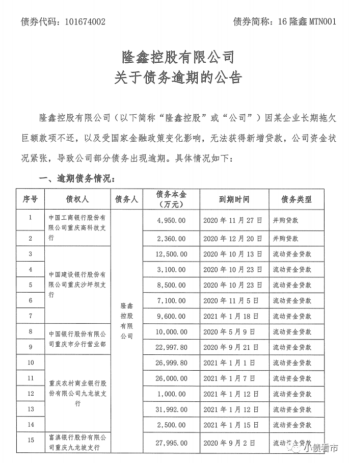 目前,在重庆市政府和隆鑫集团债委会的支持下,隆鑫控股正积极与相关债权人协商包括“债务重组”在内的方案,以期尽快于债权人达成和解,解决债务逾期问题。