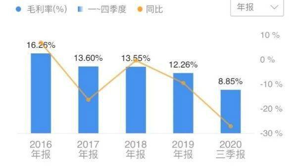 再看公司毛利率可知“冰冻三尺,非一日之寒”。实际上,自2017年至去年三季度,公司毛利率持续走低,2017年尚能达到13.6%,而去年前三季度只有8.85%,同比下降27.16%。
