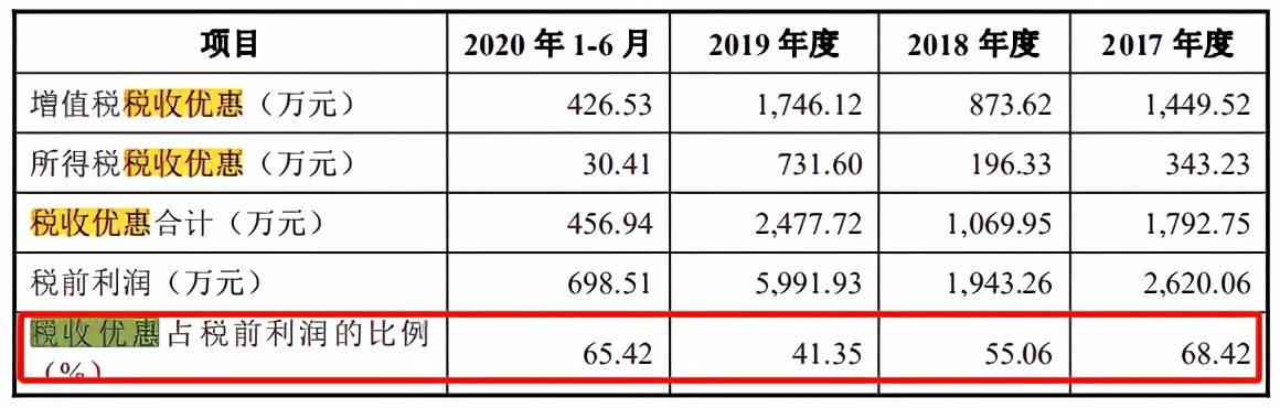 值得注意的是,报告期内紫光照明较为依赖相关税收优惠政策。2017年-2020年上半年,紫光照明的税收优惠合计分别为1792.75 万元、1069.95万元、2477.72万元和456.94万元,占税前利润的比例分别为68.42%、 55.06%、41.35%和65.42%,公司税收优惠占税前利润的比例较高。