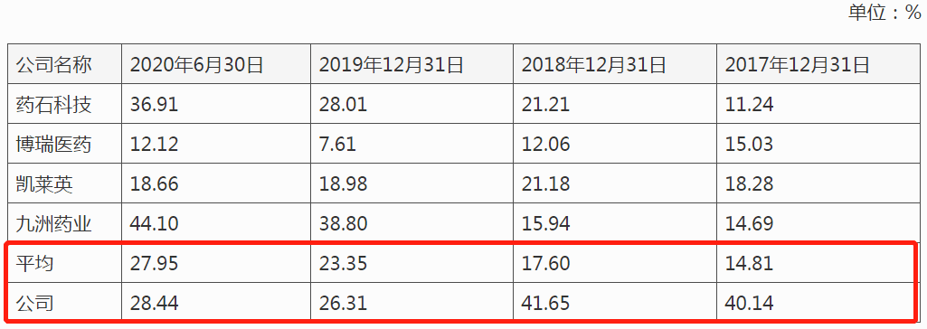 2017-2020年上半年,皓元医药的资产负债率(合并)分别为40.14%、41.65%、26.31%和28.44%,可比上市公司的资产负债率均值分别为14.81%、17.60%、23.35%和27.95%,皓元医药的资产负债率虽逐年下滑,但是和同行相比仍然高出不少。