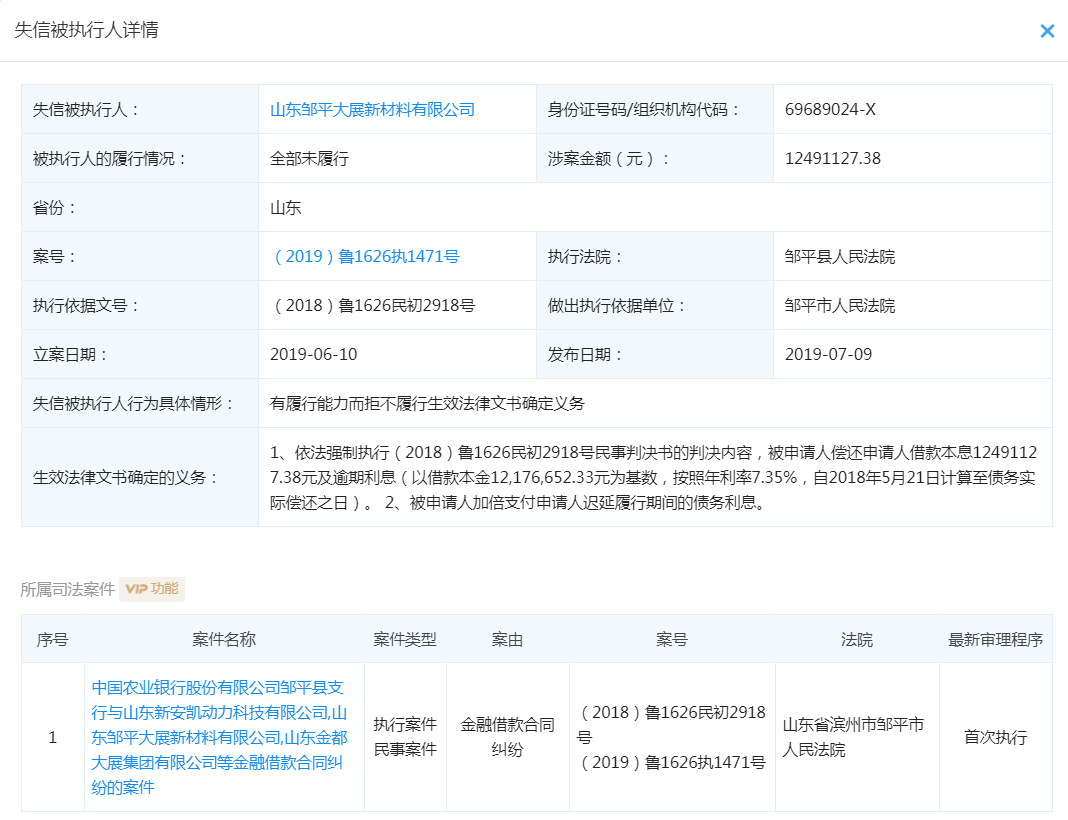 企查查显示,作为最大供应商的大展新材却被法院列为被失信执行企业。2019年6月,由于大展新材有履行能力而拒不履行生效法律文书确定义务,被有关部门依法强制执行(2018)鲁1626民初2918号民事判决书的判决内容,要求大展新材偿还申请人借款本息12491127.38元及逾期利息,加倍支付申请人迟延履行期间的债务利息。