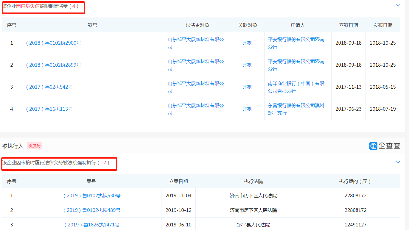 此外,大展新材曾4次因自身失信被限制高消费,因未按时履行法律义务内法院强制执行12次。