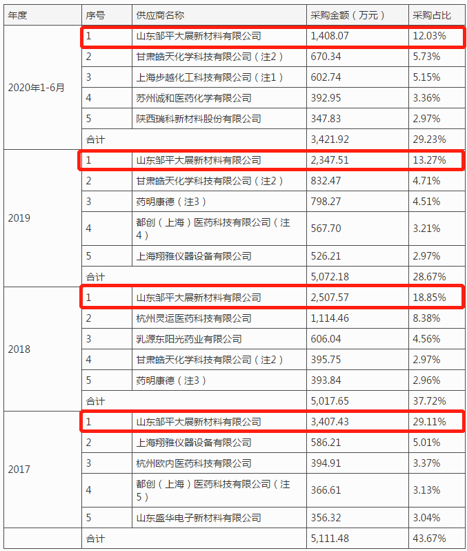 2017-2020年上半年,公司向前五大供应商采购额分别为5111.48万元、5017.65万元、5072.18万元以及3421.92万元,占采购总额比例分别为43.67%、37.72%、28.67%和29.23%。