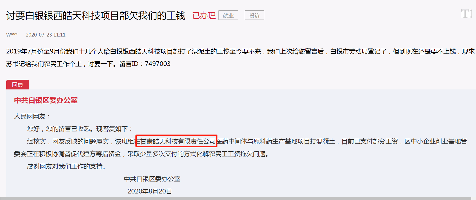 2020年8月,中共白银区委办公室进行了回复,表示网友反映的问题属实,该班组在甘肃皓天中间体与原料药生产基地项目打混凝土,目前已支付部分工资,区中小企业创业基地管委会正在积极协调督促代建方筹措资金,采取少量多次支付的方式化解农民工工资拖欠问题。