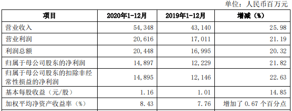 中信证券2020年业绩快报显示,去年,中信证券营业收入为543.48亿元,同比增长25.98%;归属于母公司股东的净利润为148.97亿元,同比增长21.82%。