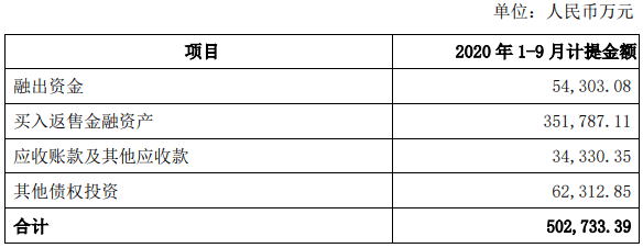 具体来看,2020年1-9月,中信证券计提融出资金减值准备人民币5.43亿元,2019年计提人民币3.60亿元;计提买入返售金融资产减值准备人民币35.18亿元,2019年计提人民币7.91亿元;计提应收账款及其他应收款减值准备人民币3.43亿元,2019年计提人民币5.16亿元;计提其他债权投资减值准备人民币6.23亿元,2019年计提人民币2.25亿元。