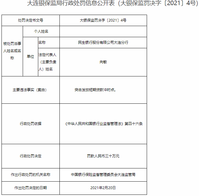 中国经济网北京3月1日讯 中国银保监会网站今日公布的大连银保监局行政处罚信息公开表(大银保监罚决字〔2021〕3号、4号、5号)显示,民生银行股份有限公司大连分行内控管理不到位,导致发生贷款违规行为;突击发放短期贷款冲时点;个人经营性贷款贷后管理不到位,部分贷款资金流入客户经理他行账户。