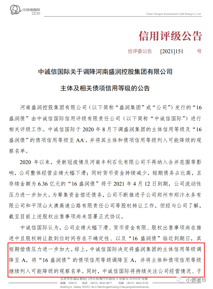 中诚信国际认为,盛润控股业绩大幅下滑、货币资金有限、股权出售事项尚在推进中且股权转让款到位时间存在不确定性、以及“16盛润债”临近到期日,其短期偿债压力进一步加大。