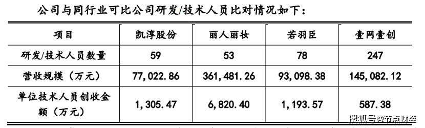 截至2020年3月末,凯淳实业共有技术研发人员59人,占员工总数的比例为4.34%。在同行业可比公司中,凯淳实业技术研发人员数量低于若羽臣的78人和壹网壹创的247人,但略高于丽人丽妆的53人,处于行业中游。