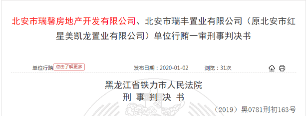 以上是2020年1月2日,审判机关公布的“北安市瑞馨房地产开发有限公司、北安市瑞丰置业有限公司(原北安市红星美凯龙置业有限公司)单位行贿一审”判决书的表述。