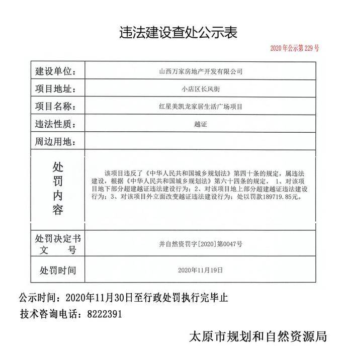 实际上,瑞丰公司的上述辩护并非强词夺理。不久前,红星美凯龙就因违规开发而被罚。2020年11月30日,太原市规划和自然资源局发布违法建设查处公示,包括红星美凯龙生活广场等12个地产项目因违规被处罚。