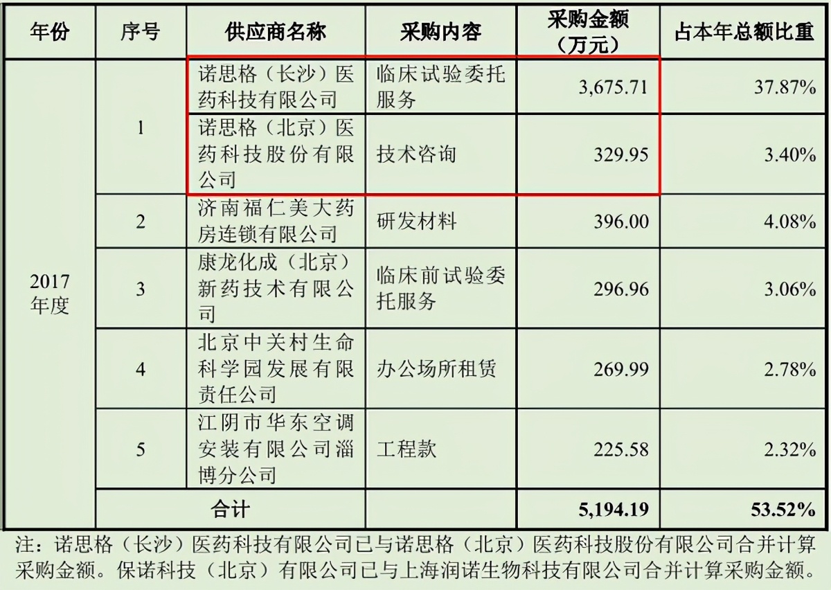 目前,客户北京盛诺基正在冲刺科创板,据其公示的招股书,诺思格是其2017年的第一大供应商,双方交易金额为4,005.66万元,这一金额包含了诺思格的二级全资子公司诺思格(长沙)医药科技有限公司(下称“长沙诺思格”)。北京盛诺基披露的诺思格与长沙诺思格的合并金额与诺思格披露的对应金额相差多达1,516.00万。