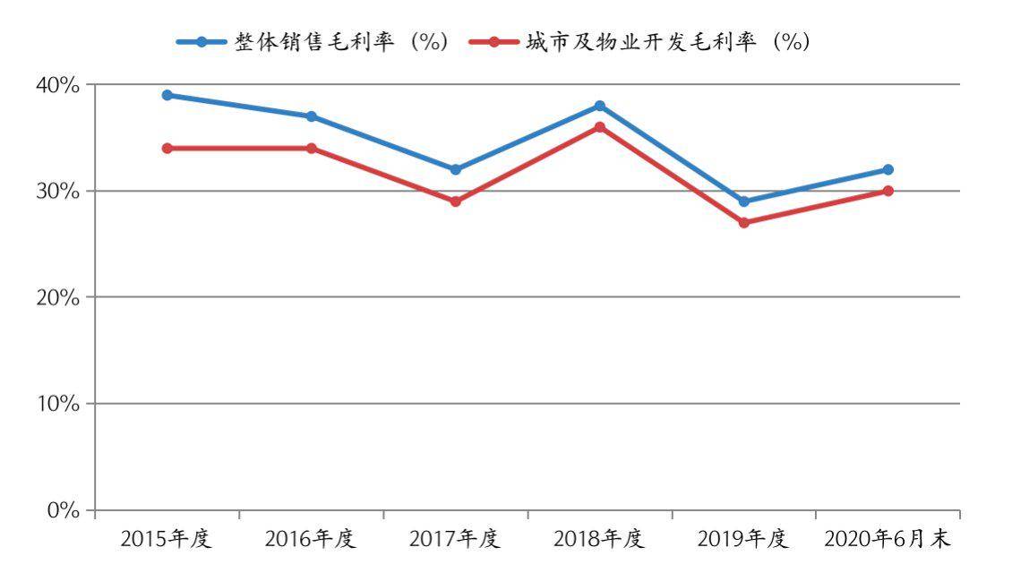 值得注意的是,中国金茂2020年业绩下挫,从半年度财务数据中或已有所显现。数据显示,截至2020年6月30日,该公司整体销售毛利率为32%,较上年同期下降5%。如果细分来看,2020年上半年,其城市及物业开发毛利率为30%,较上年同期下降4个百分点。