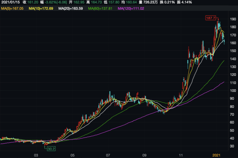 作为一家成立三年即上市的互联网公司,拼多多的发展模式足够快速且引人注目,资本市场亦给予尚佳反馈,截至美东时间2021年1月7日,拼多多最高触及187.7美元/ADS,较上市首日上涨5倍有余。但此后,该公司股价逐步走低,截至1月15日,收于161.2美元/ADS,7个交易日下降14%。