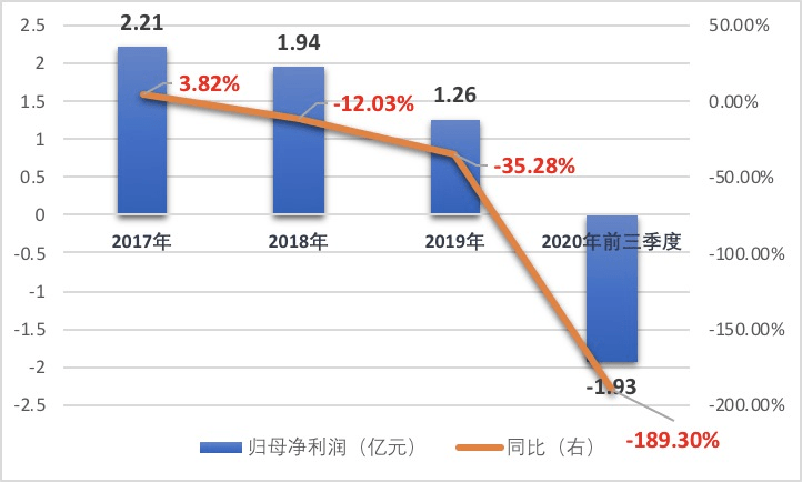 数据披露,2017年—2019年该公司营业收入分别为80.45亿元、81.80亿元和60.36亿元,业绩增速由2017年的21.23%降至2018年的1.68%,到了2019年转负,为-26.21%。同时,该公司同期归母净利润亦呈逐年递减趋势,分别为2.21亿元、1.94亿元和1.26亿元,且2018年及2019年该公司的归母净利润较上一年同期分别下滑12.22%和35.05%。