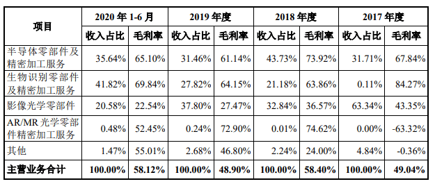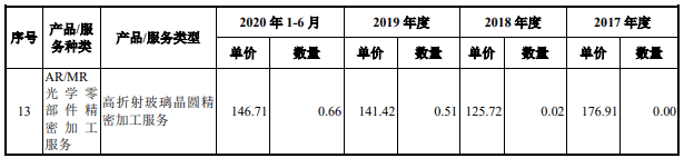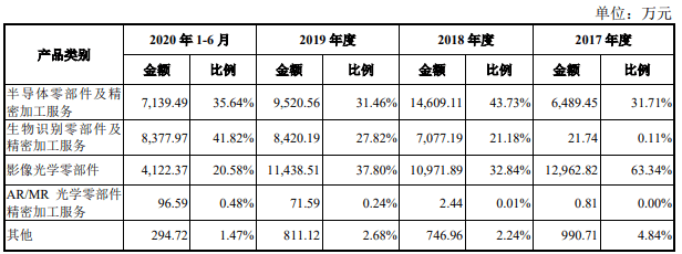 受到单价暴跌影响,上述产品的销售收入整体呈现下降趋势。2017年至2020年上半年,传感器陶瓷基板精密加工服务的销售收入分别为902.76万元、7945.10万元、4211.00万元和4162.07万元,3D结构光模组光学联结件的销售收入分别为21.74万元、7077.19万元、8420.19万元和8377.98万元,光学屏下指纹识别模组用滤光片的销售收入为6.26万元、469.25万元、336.72万元和211.97万元,智能手机摄像头滤光片组立件的销售收入为4495.04万元、2525.84万元、3580.52万元和1787.81万元。