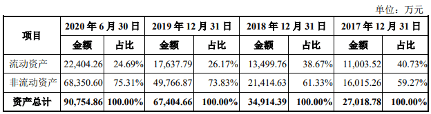 2017年至2020年上半年各期末,美迪凯资产总计分别为2.70亿元、3.49亿元、6.74亿元和9.08亿元,流动资产分别为1.10元、1.35亿元、1.76亿元和2.24亿元。