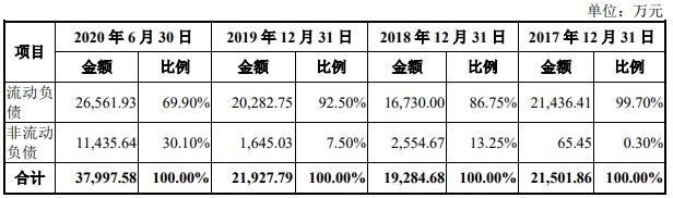 2017年至2020年上半年各期末,美迪凯的负债合计2.15亿元、1.93亿元、2.19亿元和3.80亿元,其中流动负债分别为2.14亿元、1.67亿元、2.03亿元和2.66亿元,占比分别是99.70%、86.75%、92.50%和69.90%。