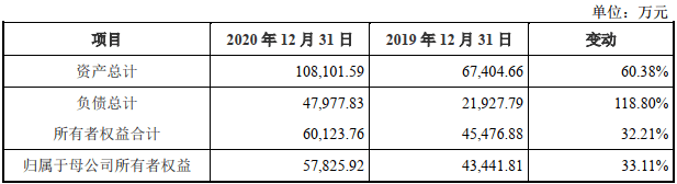 截至2020年12月31日,美迪凯总资产为10.81亿元,较上年末增长60.38%;总负债为4.80亿元,较上年末增长118.80%;归属于母公司的所有者权益为5.78亿元,较上年末增长33.11%。