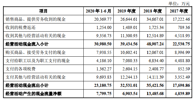 2017年至2020年上半年,美迪凯销售商品、提供劳务收到的现金分别为1.72亿元、3.47亿元、2.66亿元和2.04亿元,经营活动产生的现金流量净额分别为4839.89万元、1.35亿元、6903.54万元和7799.75万元。