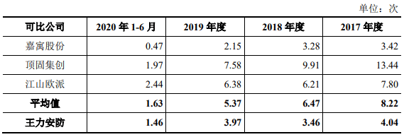 王力安防应收账款账周转率始终低于同行。各期末,王力安防应收账款账周转率分别为4.04次、3.46次、3.97次、1.46次,行业平均值分别为8.22次、6.47次、5.37次、1.63次。