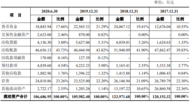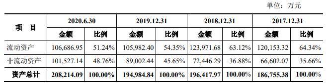 2017年-2019年及2020年1-6月,王力安防资产总计分别为18.68亿元、19.64亿元、19.50亿元、20.82亿元,其中流动资产分别为12.02亿元、12.40亿元、10.60亿元、10.67亿元,占比分别为64.34%、63.12%、54.35%、51.24%。