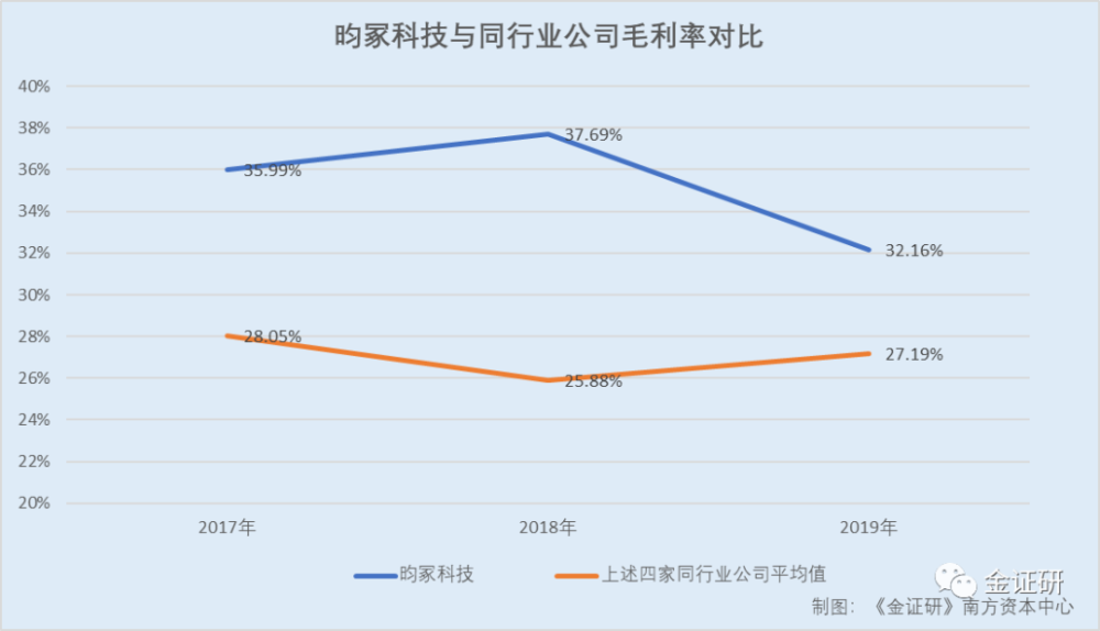 可见,2019年,昀冢科技毛利率呈下降趋势,而同行业可比公司毛利率平均值走高。