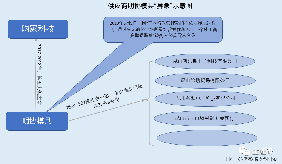 也就是说,2017-2019年,明协模具从业人数仅为3人,却累计撑起千万元采购额,且明协模具地址或与23家企业地址一致。此外,其曾因通过登记的经营场所及经营者住所无法取得联系而被列入经营异常名录,“个体户”明协模具与昀冢科技交易是否具备真实性?犹未可知。