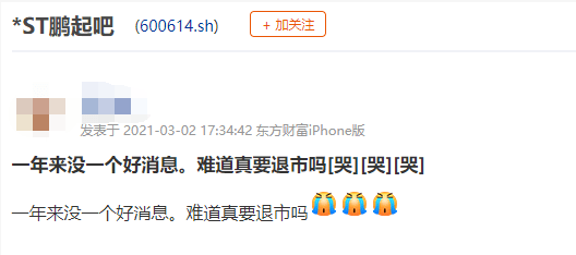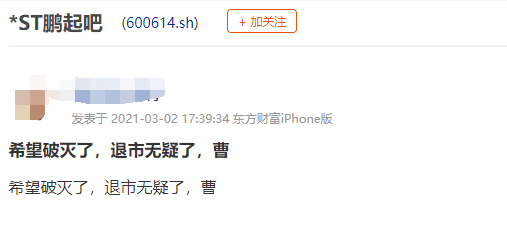 针对公司实控人涉嫌内幕交易犯罪被逮捕,有网友在股吧中称,“一年来没一个好消息。难道真要退市吗”,“希望破灭了,退市无疑了”。