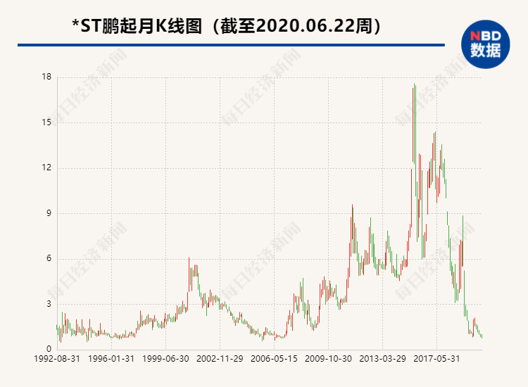 股价方面,*ST鹏起2015年股价巅峰时最高达17.58元/股,截至2020年6月23日收盘股价仅为0.74元/股,股价自2015年高点已跌去超95%,市值蒸发295亿元。