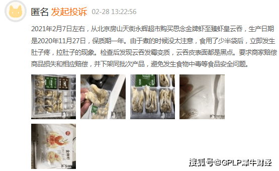 据黑猫投诉平台2月28日信息,一位用户表示,在2021年2月7日左右,从北京房山天街永辉超市购买思念金牌虾至臻虾皇云吞,生产日期是2020年11月27日,保质期一年。由于煮的时候没太注意,食用了少半袋后,立即出现肚子疼,拉肚子的现象。检查后发现云吞发霉变质,云吞皮表面都是黑点。