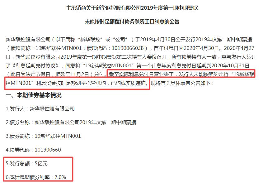 11月4日,新华联2019年度第一期中期票据(19新华联控MTN001)因截至实际利息兑付日营业终了,公司未能按照约定将利息资金按时足额划至托管机构,已构成实质违约,该债权发行总额5亿元,本计息期债权利率7.0%。