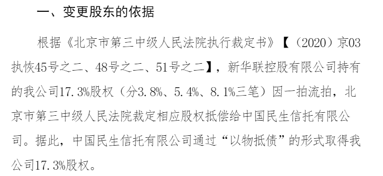 然而,截止1月4日,新华联所持的这3笔股权拍卖的状态是已流标。流拍后,亚太财险于1月27日在中国保险行业协会官网披露了《关于变更股东有关情况的信息披露公告》,公告显示,新华联持有的3笔股权因一拍流拍,北京市第三中级人民法院裁定相应股权抵偿给中国民生信托有限公司。北京市第三中级人民法院已于1月14日根据裁定书办理了“以物抵债”的工商登记手续。目前上述变更股东事项待深圳银保监局批准。