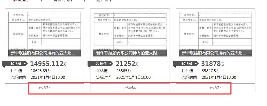 2020年12月3日,北京市第三中级人民法院发布3则司法拍卖公告,3则拍卖均为新华联所持的亚太财险股权,合计股权17.3%,总起拍价6.81%。3个拍卖标的所持股份分别是3.8%、5.4%和8.1%,评估价分别为1.86亿元、2.67亿元和3.98亿元,共8.51亿元;起拍价分别为1.50亿元、2.13亿元和3.19亿元,共6.82亿元,相比评估价打8折。