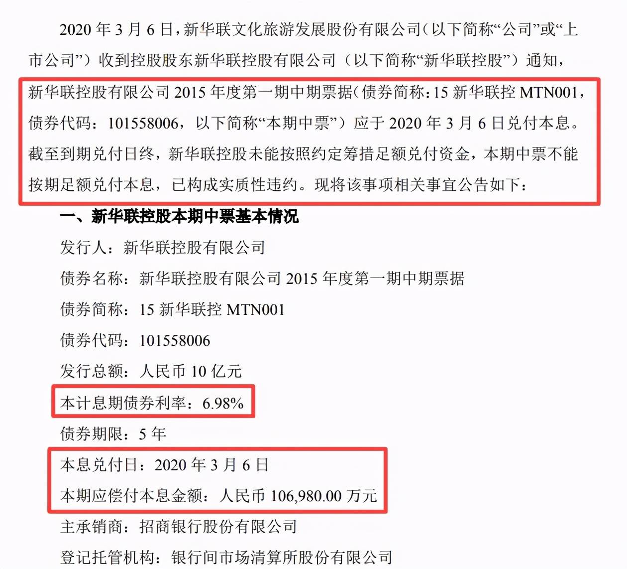 2020年3月6日,新华联2015年度第一期中期票据因未能按照约定筹措足额兑付资金,不能按期足额兑付本息,已构成实质性违约。本期债券利率6.98%,应偿付本息金额10.698亿元。