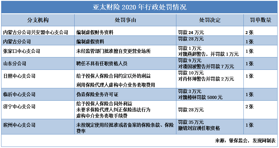 不仅如此,亚太财险还面临合规经营的风险。银保监会官网1月18日公布的行政处罚决定书显示,因编制虚假财务资料,亚太财险内蒙古分公司兴安盟中心支公司被罚款20万元。2020年亚太财险还多次因违法违规行为受到各地银保监局的行政处罚。