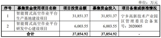 星邦智能原拟在深交所创业板公开发行股票不超过3716.67万股,不低于发行后总股本的25%。星邦智能原拟募集资金3.79亿元,其中3.19亿元用于智能臂式高空作业平台生产基地建设项目,6003.55万元用于智能臂式高空作业平台研发中心建设项目。