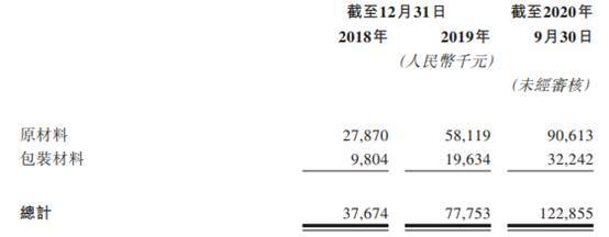 截至2018年、2019年和2020年9月30日,奈雪的茶存货总计3767.4万元、7775.3万元和1.23亿元,其中原材料分别为2787.0万元、5811.9万元和9061.3万元。
