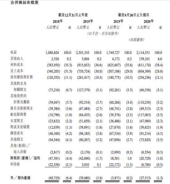 2018年、2019年及2020年前三季度,奈雪的茶营收分别为10.87亿元、25.02亿元、21.15亿元,期内亏损分别为6972.9万元、3968.0万元、2751.3万元,合计亏损1.37亿元。