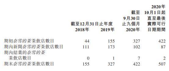 招股书披露,2017年年底奈雪的茶门店仅44间,2018年、2019年和2020年前三季度末,公司的门店数量分别为155间、327间和422间,门店数量达到3年前近十倍。