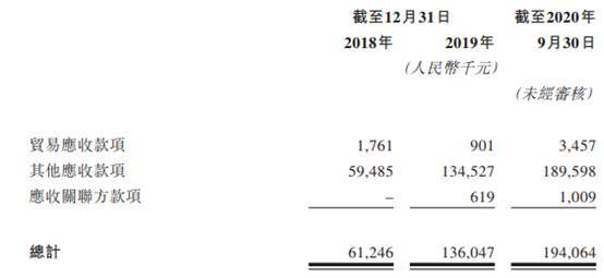 2018年、2019年与2020年前三季度,奈雪的茶应收款项总计6124.6万元、1.36亿元和1.94亿元。