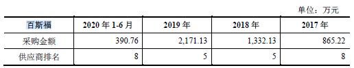2017年-2019年以及2020年上半年,力诺特玻向百斯福的采购金额分别为865.22万元、1332.13万元、2171.13万元、390.76万元,百斯福在2018年和2019年是公司的第五大客户。
