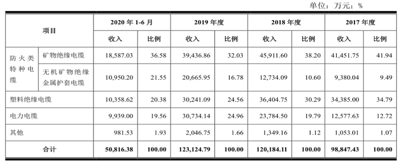 《投资时报》研究员查阅公司招股书发现,久盛电气的产品主要分为矿物绝缘电缆、无机矿物绝缘金属护套电缆、塑料绝缘电缆、电力电缆。报告期内,矿物绝缘电缆和塑料绝缘电缆的销售收入占主营业务的收入比例合计分别为76.73%、68.49%、56.59%及56.96%,是该公司最主要的销售产品,但从2019年开始,二者在销量和收入上均出现下滑现象。