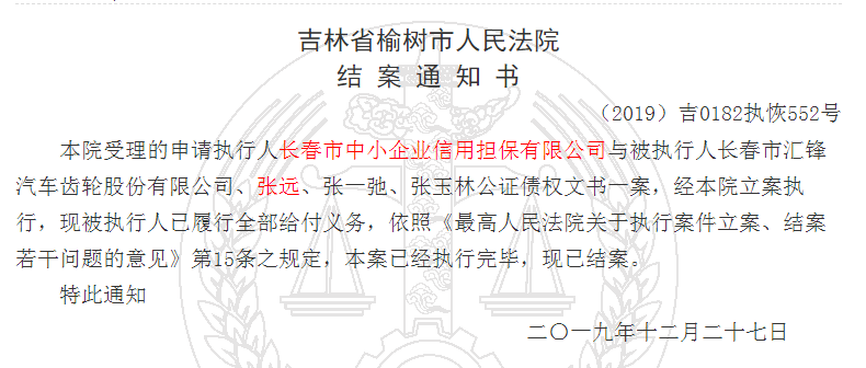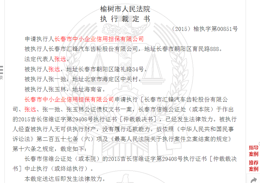 2015年12月底,榆树市法院公布了一份执行裁定书,长春中小担保公司申请执行长春汇锋(当时还是股份公司)、张远、张一弛(张远的儿子)等公证债权文书一案,因被执行人无可供执行财产,无履行还款能力,故而裁定中止执行。