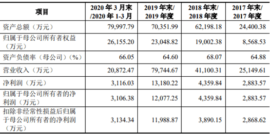 2017年至2019年以及2020年第一季度,致远装备的营业收入分别为2.51亿元、4.11亿元、7.97亿元、2.09亿元(第一季度),归母净利润分别为2883.57万元、4359.84万元、1.21亿元、3106.38万元(第一季度)。