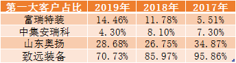 而致远装备上会稿列举的同行业可比公司富瑞特装、中集安瑞科、山东奥扬,第一大客户占比明显低于致远装备。它们在2017年至2019年第一大客户的最高占比也只有34.87%,远低于致远装备。