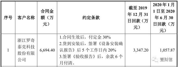 值得关注的是,根据芯碁微装与罗奇泰克的合同约定,签署《验收报告》后,余款6个月付清。截至2019年12月31日已回款3,347.20万元,而余款至2020年6月30日前仅回款1,057.87万元。